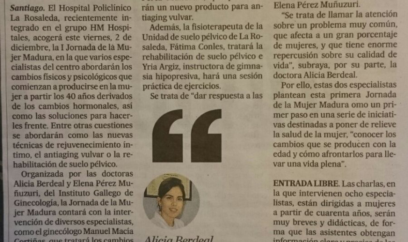 Este viernes 2 de diciembre, he participado en la "I Jornada de la Mujer Madura" organizada en el Aula de Docencia del Hospital Policlínico la Rosaleda, organizado por las doctoras Alicia Berdeal y Elena Pérez Muñuzuri del Instituto Galego de Ginecología con la ponencia "Sexualidad a los 50: Gestión de cambios y vivencia plena".